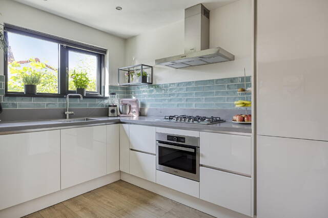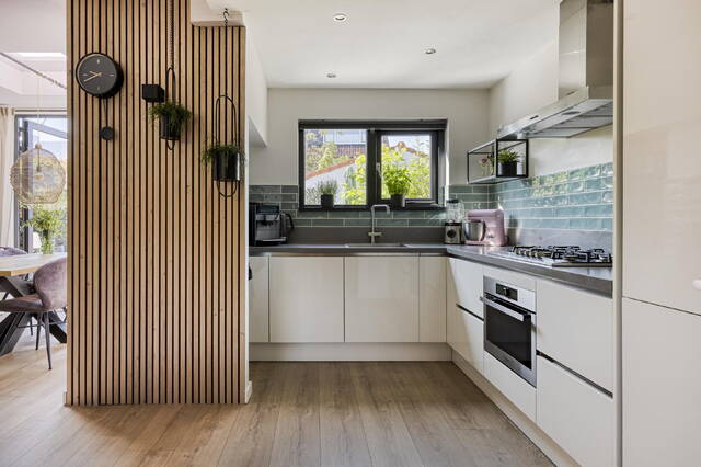 Terug in de woonkamer lopen we de moderne open keuken in, die is uitgerust met alle benodigde inbouwapparatuur zoals een 5-pits gaskookplaat, rvs afzuigkap, oven, koelkast, vriezer, vaatwasser én een praktische kelderkast. De keuken is uitgevoerd in strak wit met een mooi composieten blad. Er is op het blad veel werkruimte en plaats voor de koffiemachine, keukenmachine etc. In het plafond zijn spots ingebouwd, zodat je comfortabel licht hebt tijdens het koken. De handgebakken groene tegeltjes maken de keuken net even af en door het keukenraam komt lekker veel licht binnen.