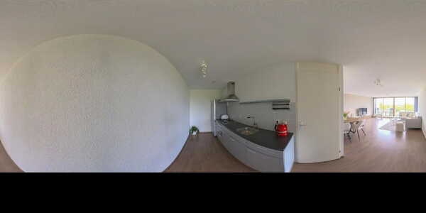 De open keuken (ca. 8 m²) is uitgevoerd in een stijlvolle grijstint met een donkergrijs kunststof werkblad. De keuken is ingericht met moderne apparatuur, waaronder een combimagnetron, een 4-pits gaskookplaat en een vrijstaande koel-vriescombinatie. Vanuit de keuken is toegang tot de bergkast met aansluitingen voor wasmachine en droger, en een WTW-installatie voor een gezond binnenklimaat.