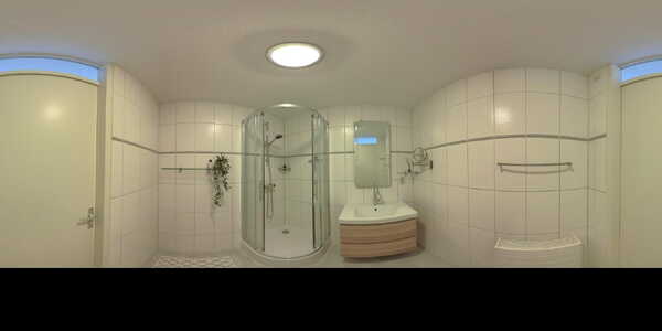 De badkamer (ca. 4 m²) is geheel betegeld in een lichte kleur en beschikt over een halfronde douchecabine en een wastafelmeubel, voor een luxe en frisse uitstraling.