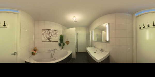 De badkamer (ca. 6 m²) is compleet en modern ingericht met ligbad, aparte douchecabine, dubbel wastafelmeubel en wit/grijze tegels. Daarnaast is er een aparte toiletruimte op de gang, waardoor comfort en privacy gewaarborgd worden.