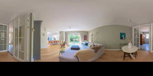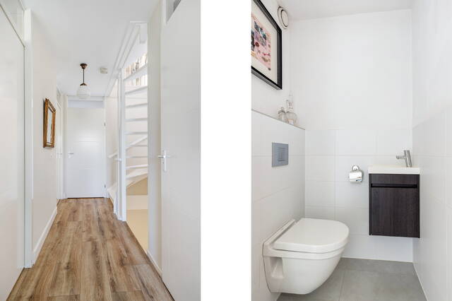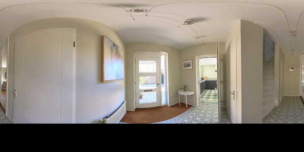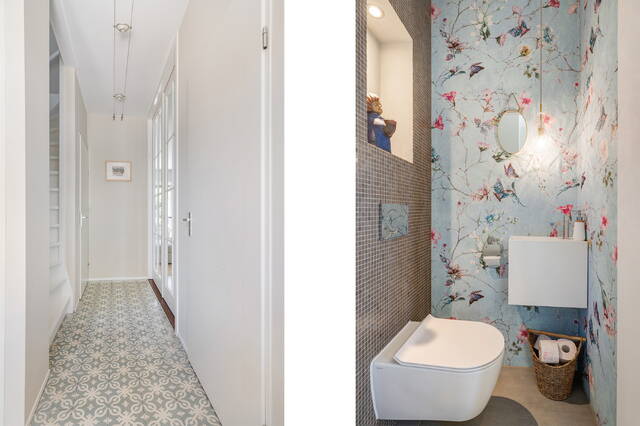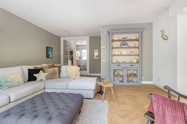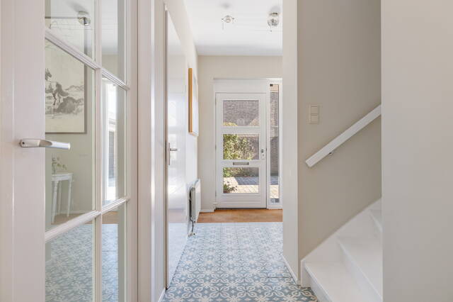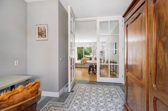 Via de ruime voortuin bereikt u de entree van de woning. In de hal vindt u de meterkast, trapkast en een modern toilet met fonteintje. Vanuit hier leidt een paar statige, dubbele glazen paneeldeuren u naar de woonkamer.
