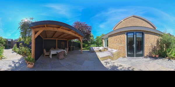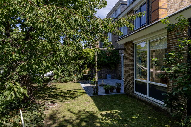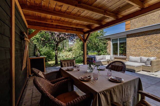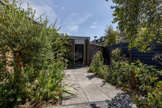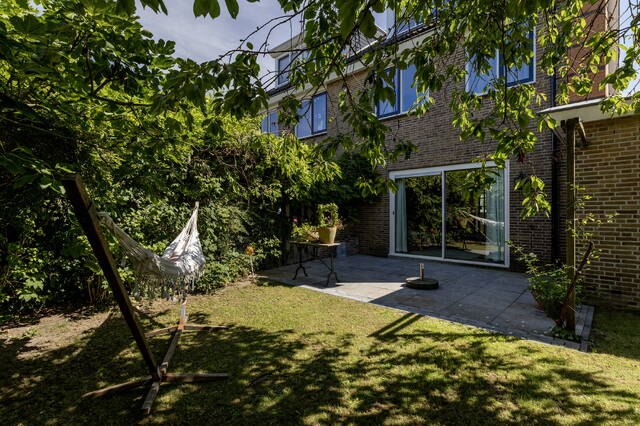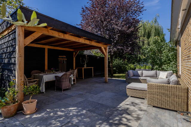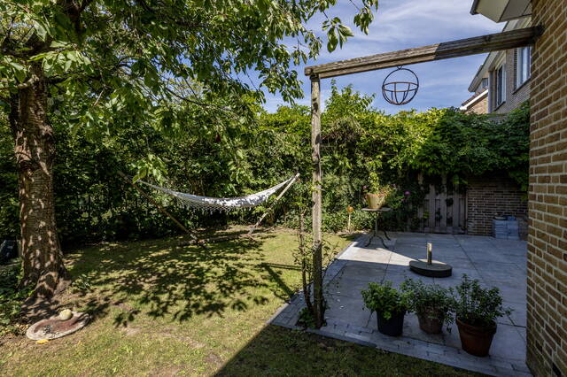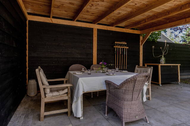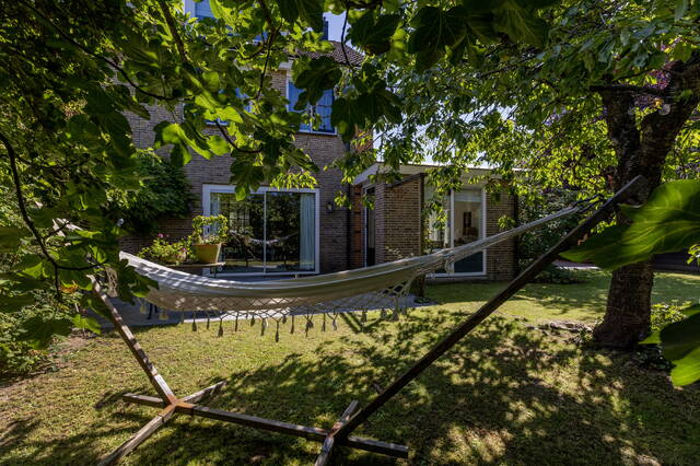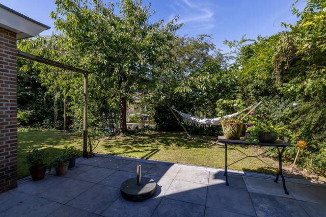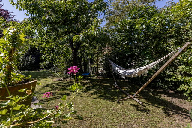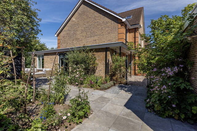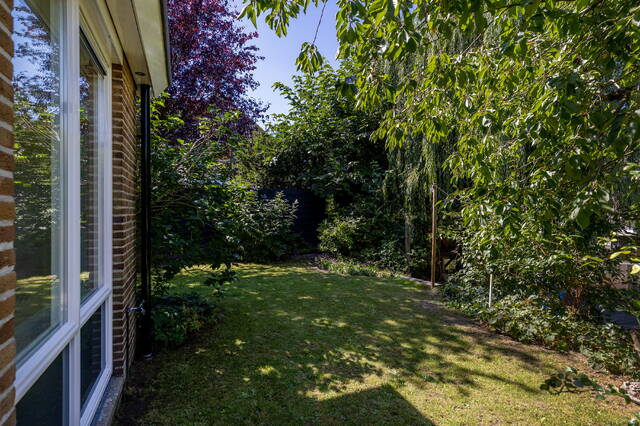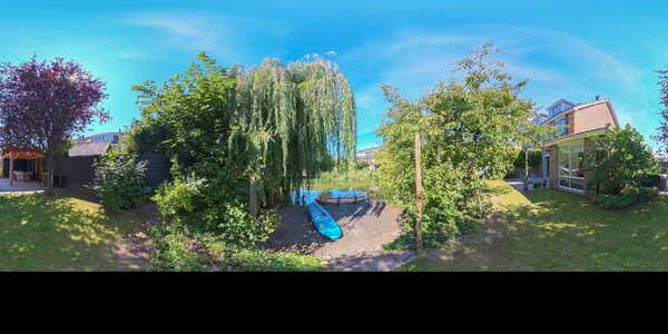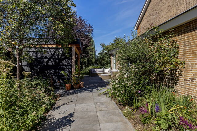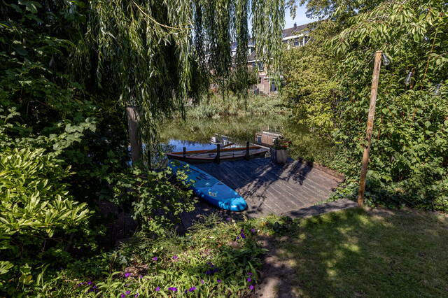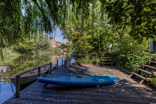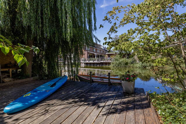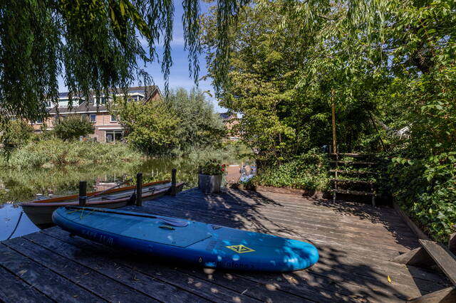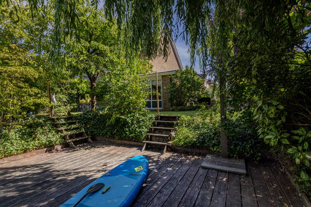 Buiten is de tuin een waar paradijs voor de liefhebber. Dankzij de ligging rondom de woning is er altijd een plek in de zon of juist in de schaduw. U vindt er een kleurrijke bloementuin, gras, verschillende zitjes, een veranda en een ruime vlonder aan het water. Aan de waterkant zorgt een majestueuze treurwilg voor een sfeervol en beschut plekje om te ontspannen of te dineren. In de tuin staan bovendien een kersenboom, een vijgenboom en een hazelnootboom, een idyllisch stukje natuur aan huis.