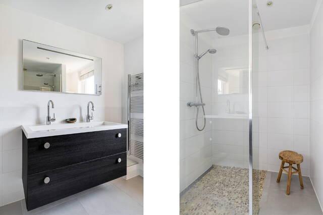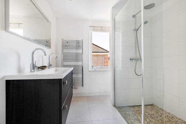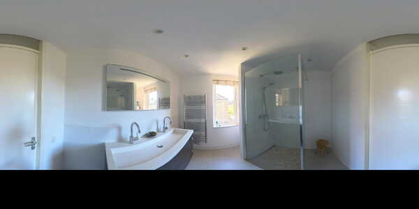 De badkamer (ca. 6 m²) is modern en functioneel, met een ruime inloopdouche en een dubbel wastafelmeubel met een verlichte spiegel, ideaal voor een druk gezin. Voor extra gemak is er een separate toiletruimte op de overloop.