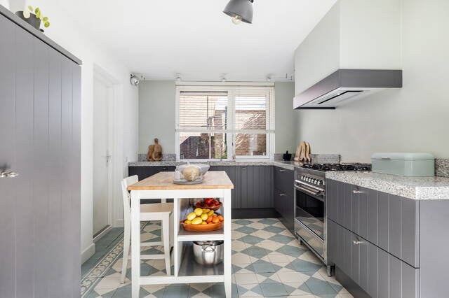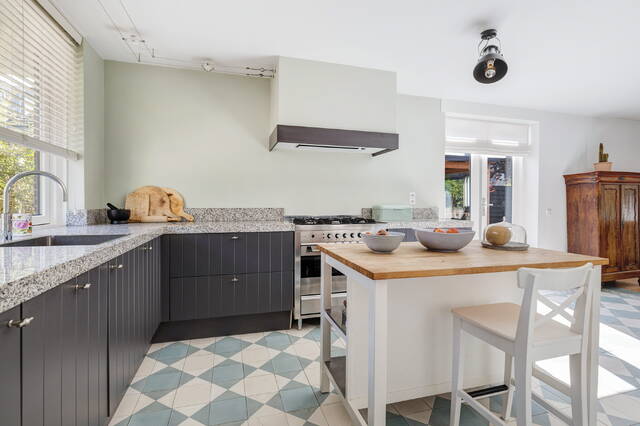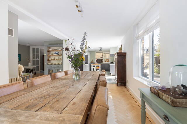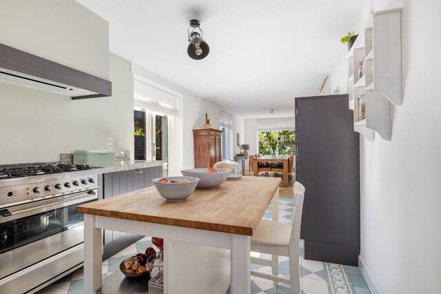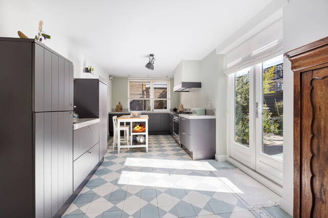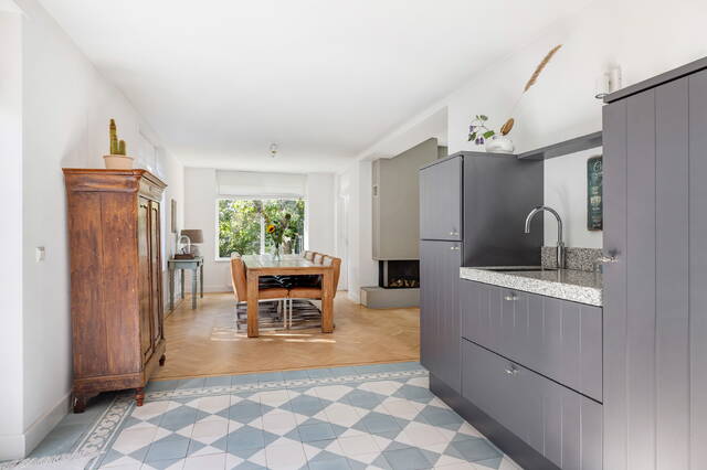 Naast de woonkamer ligt de royale woonkeuken: het echte hart van het huis. Met ramen rondom en openslaande deuren naar de zijtuin is dit een plek waar koken, eten en samenzijn samenkomen. De keuken heeft een speelse opstelling met een hoekgedeelte én een vrijstaande wand die is ingericht als coffee corner. Hier vindt u een eigen spoelgedeelte met Quooker, een aparte koelkast en vriezer, terwijl in het hoekdeel onder andere de vaatwasser en een breed 5-pits gasfornuis met oven zijn opgenomen. De vloer is afgewerkt met stijlvolle Porto Castelo tegels, voorzien van vloerverwarming. De totale living (woonkamer en keuken) is maar liefst 63 m²!