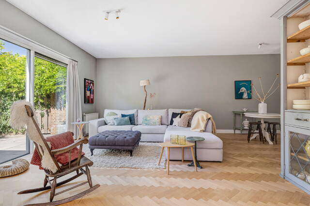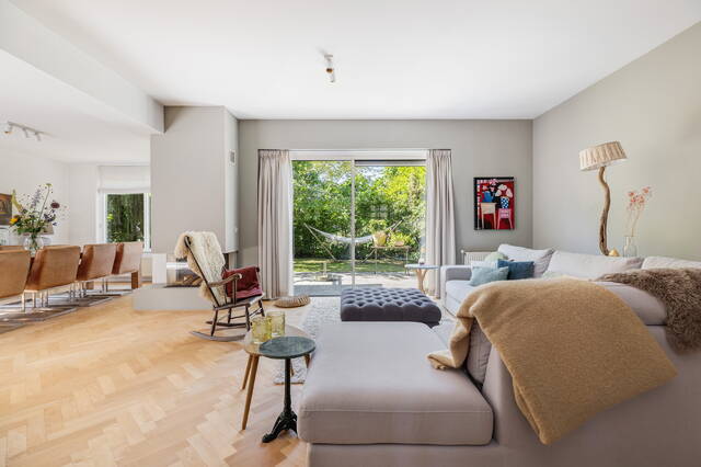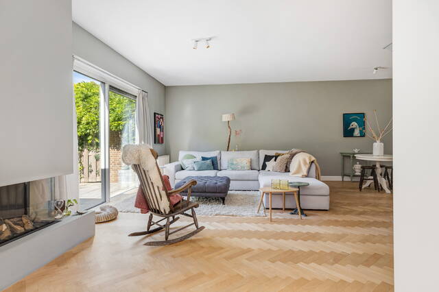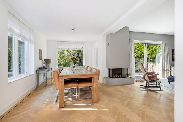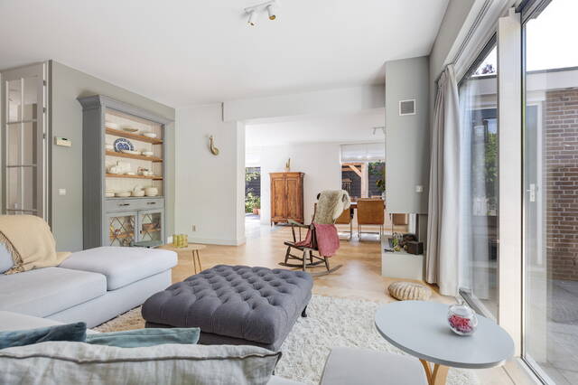 De woonkamer is heerlijk licht dankzij de grote schuifpui naar de achtertuin. Hier heeft u volop zicht op het groen en directe verbinding met de tuin. De gas open haard zorgt voor extra sfeer en warmte op de donkere dagen. Aan de voorzijde bevindt zich een afgesloten werkkamer