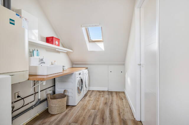 De tweede verdieping verrast door de ruimte en veelzijdigheid. De overloop is groot en licht dankzij twee Velux-dakramen, en biedt plek voor de wasmachine en droger, met daarnaast een vaste wastafel en extra bergruimte achter de knieschotten.