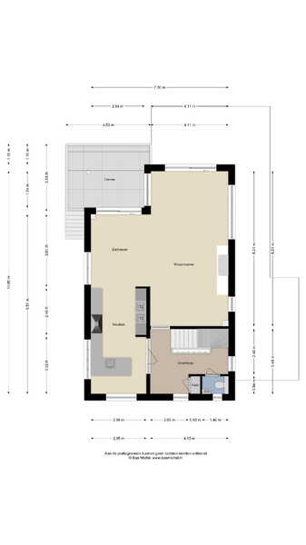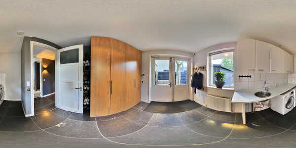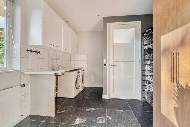 Wasruimte (ca. 12 m2) is gelegen aan de achterzijde van de woning en beschikt over een vloer van Belgisch hardsteen met vloerverwarming, 4-deuren vaste kasten en een pantry met de aansluiting voor de wasapparatuur, een wasbak met een koud- en warmwaterkraan en extra kastruimte. Middels openslaande deuren met elektrisch bedienbaar rolluik heeft u toegang tot de zij/achtertuin.