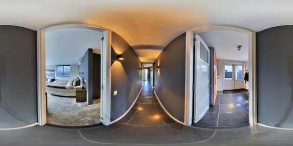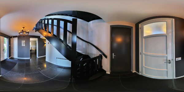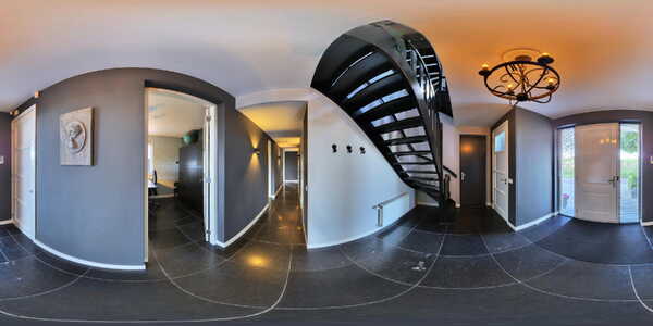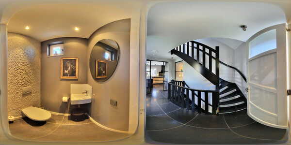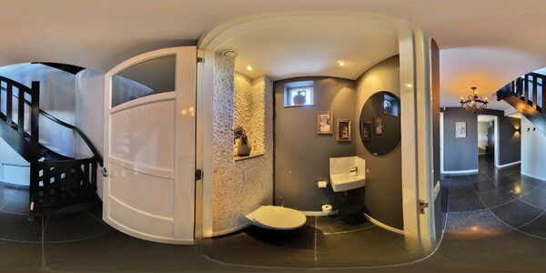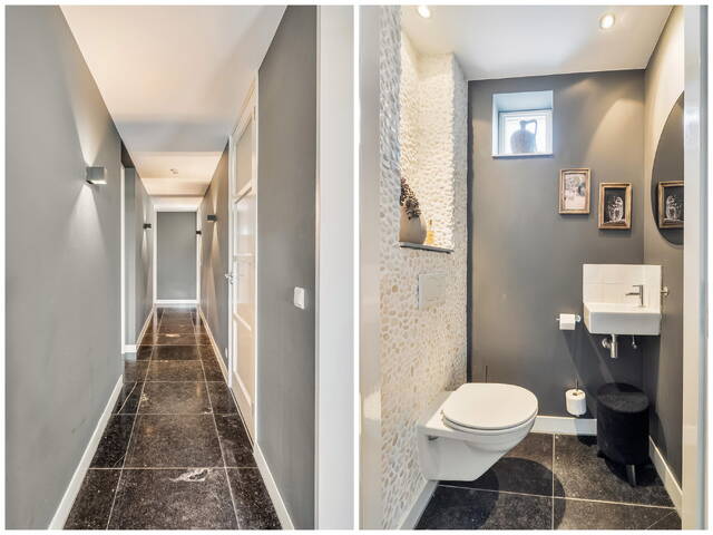 Overloop met trap naar de tweede verdieping, bergkast, fraai afgewerkte toiletruimte voorzien van een hangend toilet en fonteintje. De toiletruimte is geheel betegeld in een lichte kleurstelling en afgewerkt met spotjes. Middels een sfeervolle stalen deur heeft u toegang tot het woongedeelte.