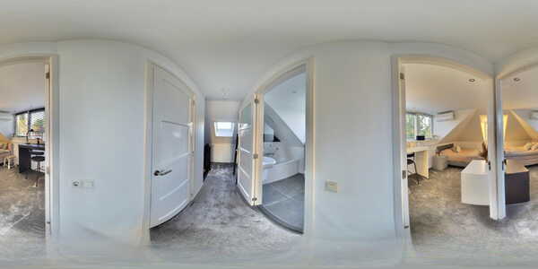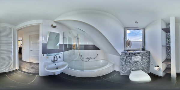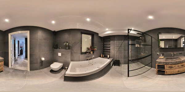 Aangrenzende badkamer (ca. 10 m2) met luxe sanitaire voorzieningen zoals wastafel met wastafelmeubel, spiegel met spiegelkast en verlichting, hangend toilet, designradiator, whirlpool met verlichting en massagejets, en een inloopdouche met regendouche. De badkamer is verder geheel betegeld en afgewerkt met spotjes, tegelvloer met vloerverwarming en geluidsinstallatie.