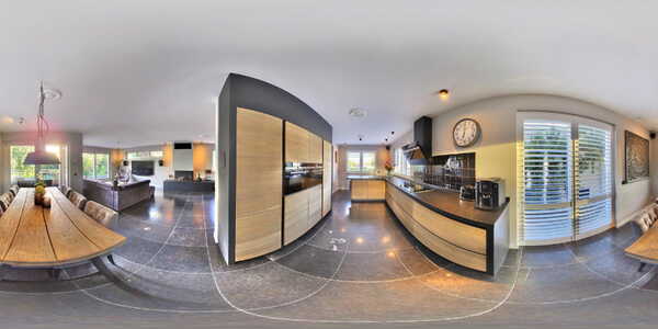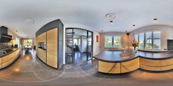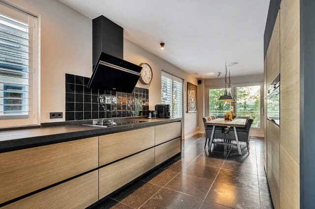 De moderne open keuken (bouwjaar 2021) is gelegen aan de voorzijde van de woning en is uitgevoerd in een L-opstelling met een gezellige ontbijtbar. Deze complete keuken is voorzien van diverse inbouwapparatuur van het merk Siemens zoals koelkast, vrieskast, inductie kookplaat met een wokbrander op gas, design afzuigkap, stoomoven, combi-ovenmagnetron en een vaatwasser. Tevens is de keuken voorzien van een enkele spoelbak met een heet/bruisend Quooker kraan, ingebouwde USB-aansluiting, stopcontacten voor uw keukenmachines op het keukenblad en voldoende kastruimte met grote laden. Het geheel is uitgevoerd in zwarte en houten kleurstelling en is afgewerkt met een natuurstenen aanrechtblad. De vloer bestaat uit Belgisch hardsteen met vloerverwarming en shutters op de raampartijen aan de voor- en zijkant. De open keuken vormt het kloppend hart van de woning en sluit moeiteloos aan op het woongedeelte.