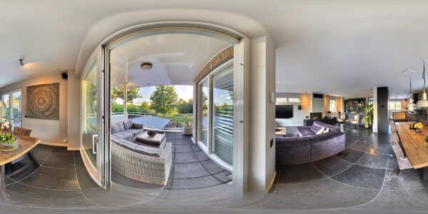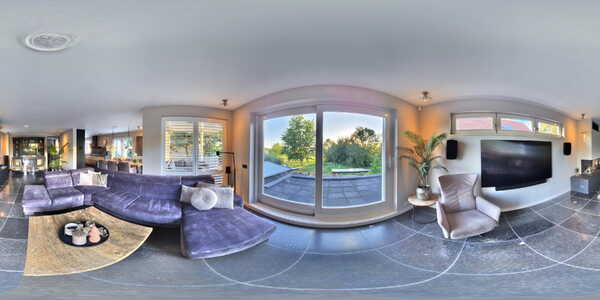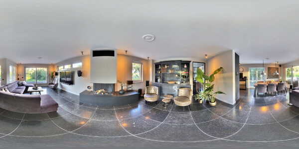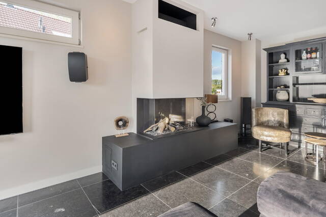 Sfeervol woongedeelte voorzien van een fraaie vloer van Belgisch hardsteen met vloerverwarming, een airconditioningsysteem dat zorgt voor de verwarming en koeling van de verdieping, een sfeervolle gashaard, elektrisch bedienbaar screen en shutter aan de zijkant van de woning. De elegante stalen glazen wand en de grote raampartijen in de woonkamer laten extra daglicht binnen en creëren een ruimtelijk gevoel. Het bedieningspaneel van het Domoticasysteem systeem waarmee u verlichting, verwarming, beveiliging en geluid eenvoudig bedient bevindt zich ook in de woonkamer. Middels openslaande deuren heeft u toegang tot het gezellige balkon met een mooi uitzicht over de achtertuin en het natuurgebied.