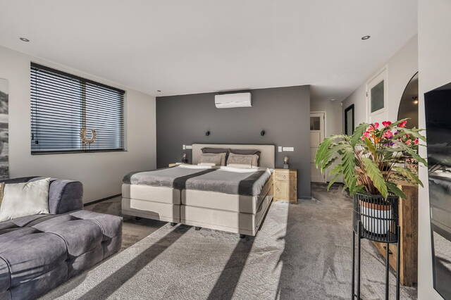 Slaapkamer 4 (ca. 9 m2) is gelegen aan de achterzijde van de woning en is voorzien van een 2-deuren vaste kast, bergruimte achter het knieschot, airconditioningsysteem, een kunststof dakkapel aan de zijkant van de woning en spotjes.