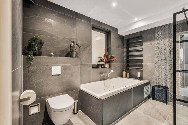 Moderne badkamer (ca. 3 m2) met sanitaire voorzieningen zoals een wastafel, spiegel, hangend toilet, ligbad met douchescherm en designradiator. Deze badkamer is geheel betegeld, afgewerkt met spotjes en beschikt over extra ruimte dankzij een kleine dakkapel.