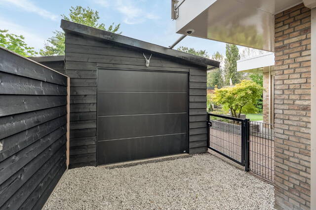 De houten schuur/garage (ca. 20 m2) beschikt over een elektrische garagedeur, een pantry met een wasbak met koud/warm waterkraan, boiler, vaatwasser en koelkast. De openslaande ramen aan de achterzijde bieden een gezellige verbinding met de overkapping.