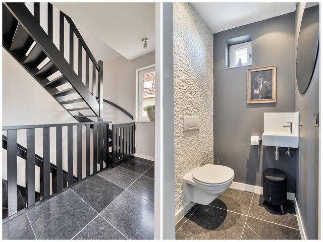 Entree met ruime hal, meterkast en trap naar de 1e verdieping. Vanuit de hal heeft u toegang tot de inpandige garage en een fraai afgewerkte toiletruimte, voorzien van een hangend toilet en fonteintje. De toiletruimte is geheel betegeld in een lichte kleurstelling.