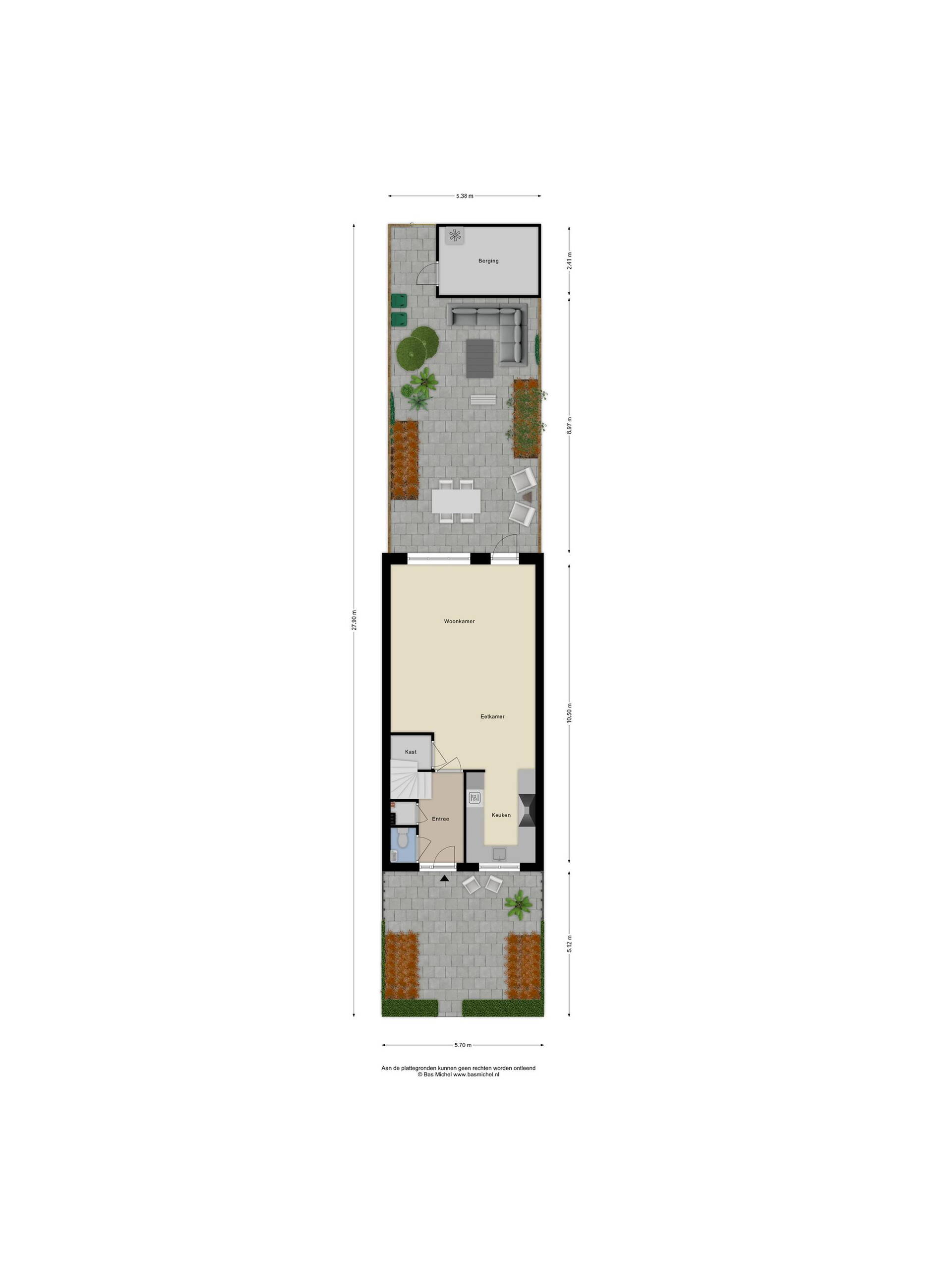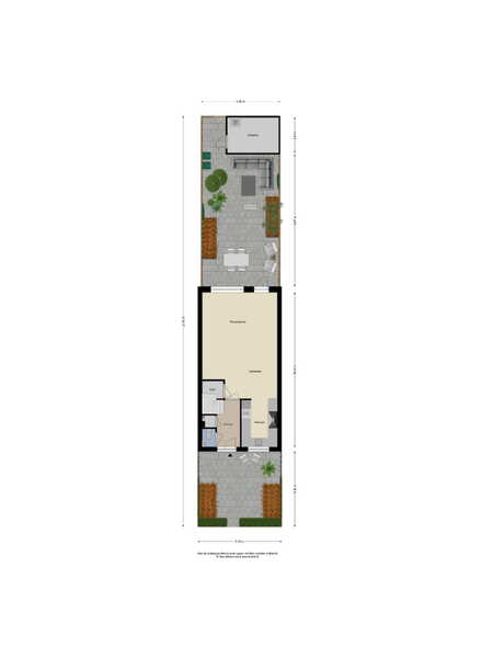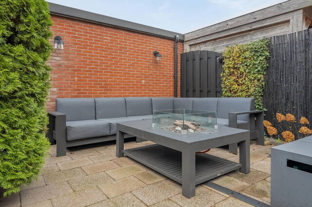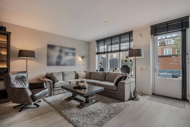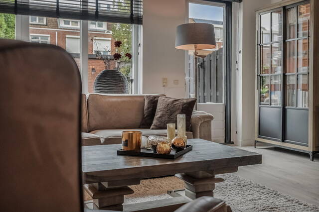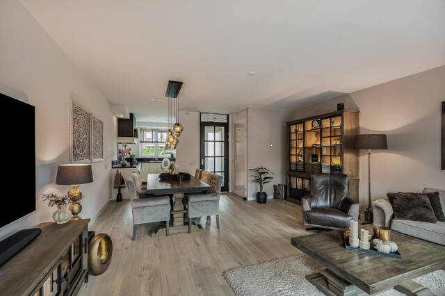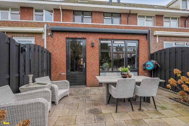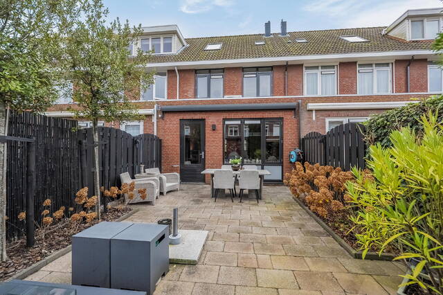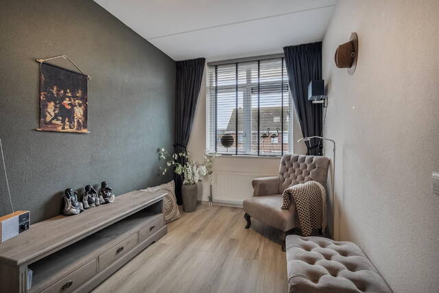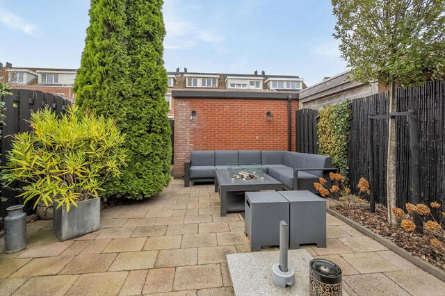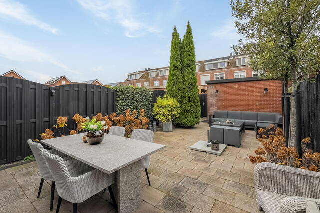 De tuingerichte woonkamer biedt een aangename leefruimte met toegang tot de achtertuin, die op het noordwesten is gelegen. De tuin is sfeervol aangelegd met sierbestrating, diverse groene borders en meerdere terrassen voor een fijne zitplek op elk moment van de dag. Achterin staat een stenen berging en aan de woning bevindt zich een elektrisch bedienbaar zonnescherm.