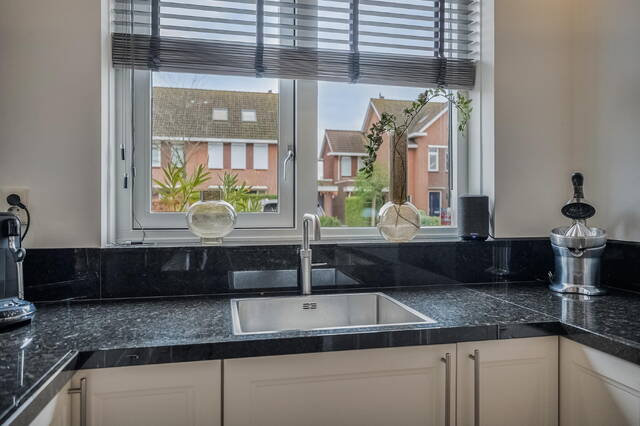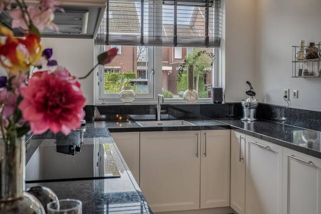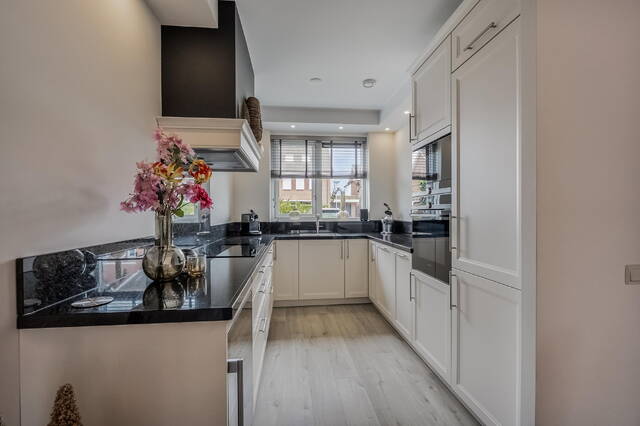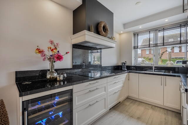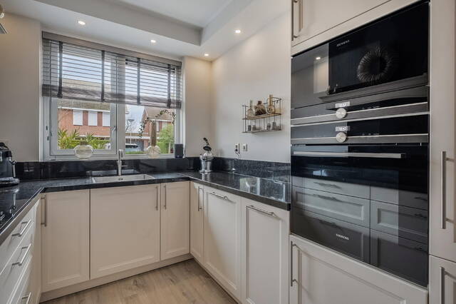 Aan de voorzijde bevindt zich de luxe open keuken (Tielemans Keukens, 2019), uitgevoerd in een lichte tint met een donker natuurstenen werkblad. De keuken is compleet uitgerust met hoogwaardige Siemens apparatuur: koel-/vriescombinatie, oven, magnetron, Quooker, klimaatkast en een 5-pits inductiekookplaat met geïntegreerde afzuiging in de schouw. Inbouwspots in het plafond maken het geheel af.