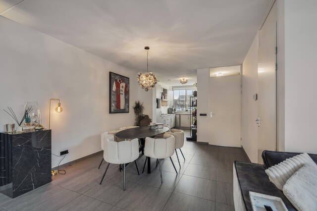 Aan de voorzijde van de woning bevindt zich de open keuken. Deze is uitgevoerd in een L-opstelling onder het raam en afgewerkt in een rustige wit-grijze kleurstelling met een houtkleurig werkblad. De keuken beschikt over diverse inbouwapparatuur, waaronder een koelkast, vaatwasser, 5-pits gaskookplaat, afzuigkap, combi-oven en een Miele stoomoven. Een prettige, lichte keuken waar alles logisch is ingedeeld en waar je door het raam vrij wegkijkt over de straat.