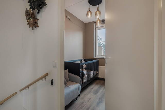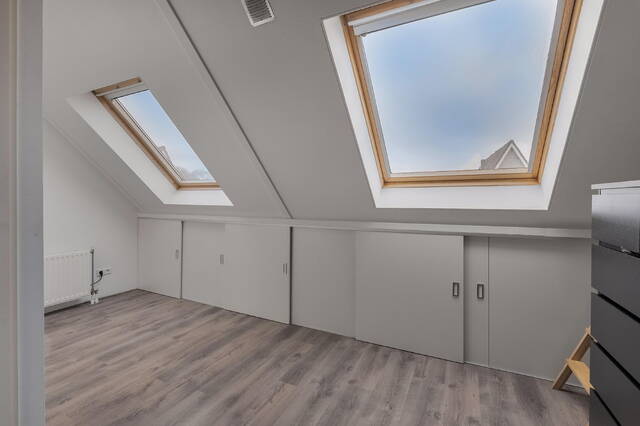 Via de vaste trap komen we op de tweede verdieping. Aan de achterzijde bevindt zich slaapkamer vier, voorzien van twee Velux dakramen die zorgen voor prettig daglicht.