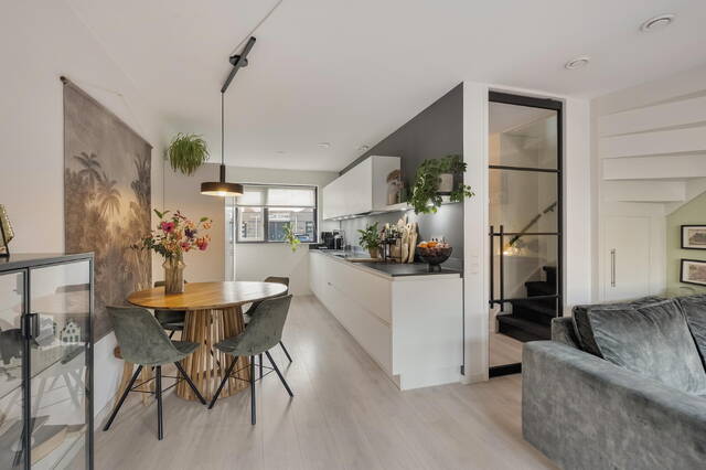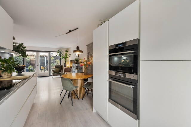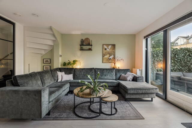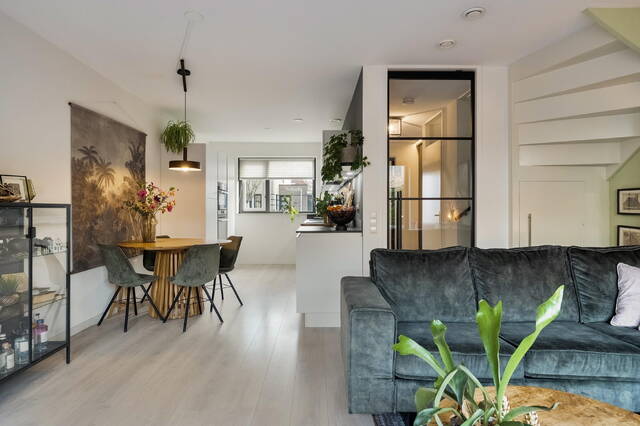 De woonkamer is bereikbaar via een fraaie zwart stalen taatsdeur en voelt direct licht en uitnodigend aan dankzij de grote raampartijen en de openslaande deuren naar de achtertuin. De laminaatvloer zorgt voor een warme en moderne uitstraling. Daarnaast beschikt de woonkamer over een handige bergruimte onder de trap.