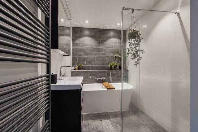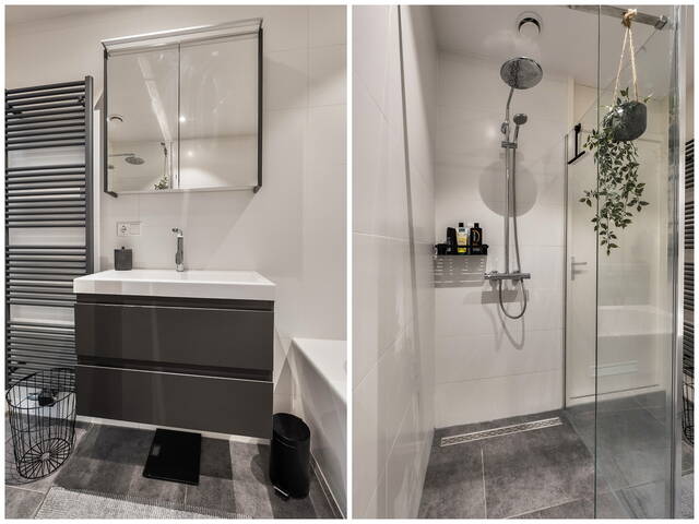 De moderne badkamer is compleet ingericht met een half vrijstaand ligbad, een inloopdouche cabine, een wastafelmeubel met spiegelkast en dimbare spotverlichting in het plafond. De gehele verdieping is afgewerkt met een sfeervolle laminaatvloer.