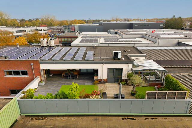 De bovengelegen woning – gebouwd in 2019 – is een luxe appartement met een hoogwaardige afwerking, veel leefruimte, een zonnig dakterras en duurzame installaties zoals 50 zonnepanelen en warmtepompen. Een eigen entree zorgt ervoor dat de woning volledig zelfstandig te gebruiken is, eventueel te verhuren of ideaal voor wonen boven het eigen bedrijf.