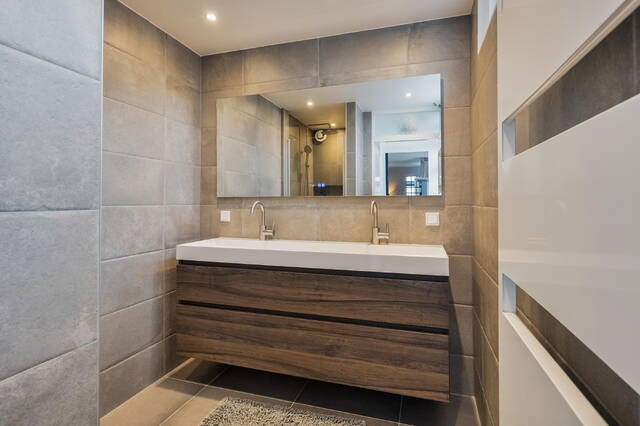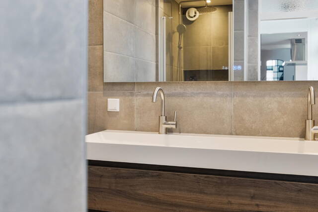 De badkamer (2023) is strak en luxe afgewerkt met grijze tegels, inbouwspots, een inloopdouche met regendouche, een breed dubbel wastafelmeubel en een elektrische radiator. Alles bevindt zich op de begane grond - praktisch en comfortabel.