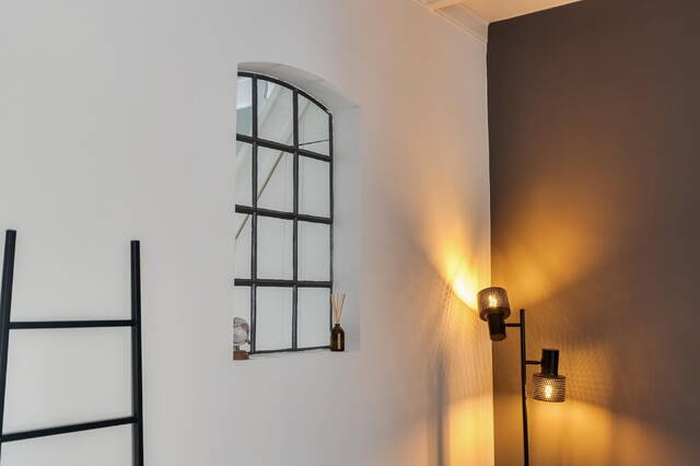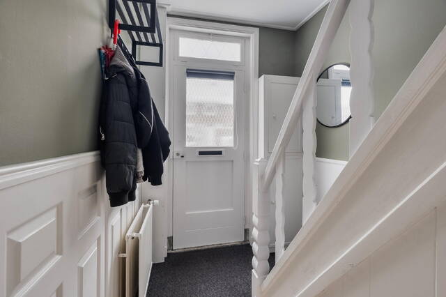Via de verzorgde voortuin kom je binnen in de hal. Het glas-in-lood stalraam geeft direct een doorkijkje naar de woonkamer en zet meteen de toon: warm, karaktervol en uitnodigend.