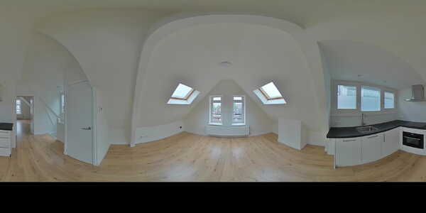 Via de gezamenlijke entree bereik je op de tweede verdieping je eigen voordeur. Achter de voordeur kom je binnen in een kleine hal waar je je jas kunt ophangen. Vervolgens loop je door naar de derde verdieping, waar je binnenkomt in de lichte en ruimtelijke woonkamer met open keuken. Dankzij de dakramen is het hier heerlijk licht. Het vloeroppervlak bedraagt circa 65 m², maar door de schuine kap mag alleen vanaf 1,5 meter hoogte het officiële woonoppervlak (circa 37 m²) worden meegeteld.