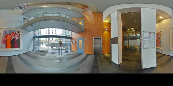 Op de begane grond kom je via de brievenbussen de centrale hal binnen waar zich drie liften bevinden. Op de 26e etage stap je uit en loop je richting je eigen voordeur.