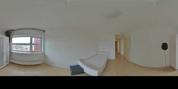 Terug in de hal lopen we naar links, naar de eerste slaapkamer. Die heeft – net als de woonkamer – prachtig uitzicht over de oostkant van de stad. De kamer is ruim 10 m² en daarmee groot genoeg voor een tweepersoonsbed en een kledingkast, maar ook ideaal als werkkamer!