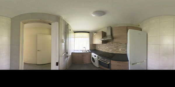De keuken (ca. 5 m²), gelegen aan de achterzijde, is uitgevoerd in een praktische hoekopstelling en is voorzien van een 4-pits inductiekookplaat en een RVS afzuigkap. Tevens is hier de aansluiting te vinden voor de wasmachine.