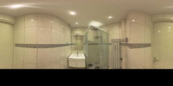 De badkamer (ca. 2 m²) is eveneens toegankelijk vanuit de hal en beschikt over een douchecabine en een wastafelmeubel. De ruimte is geheel betegeld in een lichte kleurstelling voor een frisse uitstraling.