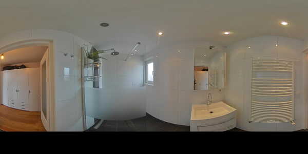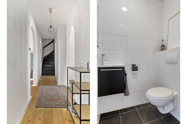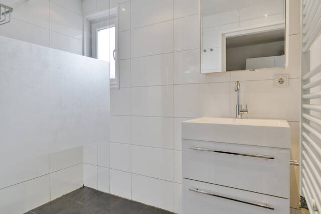 Terug in de hal treffen we de moderne badkamer met ruime inloopdouche, wastafelmeubel met mengkraan en spiegelkast erboven. Het is fijn dat je een groot raam hebt voor daglicht. De laatste deur op de overloop is die naar de aparte ruimte voor de wasmachine en de CV-ketel.