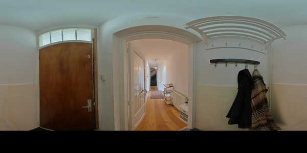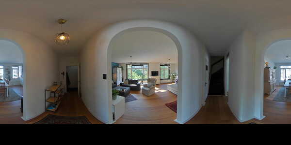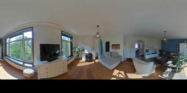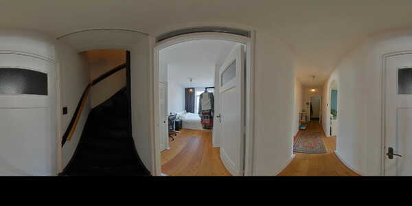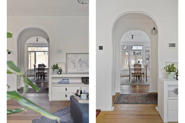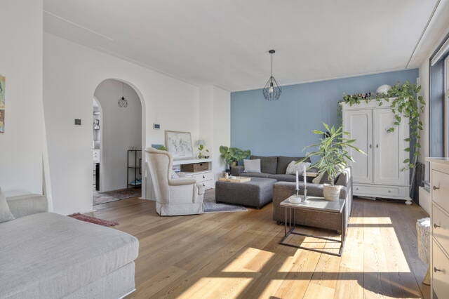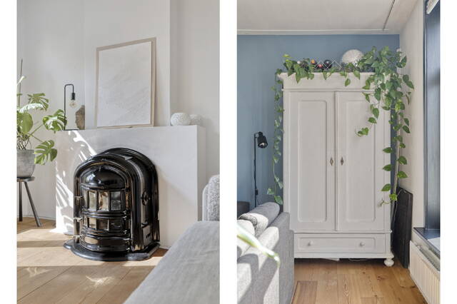 Op de begane grond lopen we het gesloten portiek binnen waar we ook direct de brievenbussen treffen. We kunnen hier met de trap naar beneden naar de gemeenschappelijke fietsenkelder en met de trap naar boven naar de appartementen. We starten op de derde verdieping. Je stapt de ruime, lichte hal binnen en loopt direct links de royale woonkamer in – licht, ruim en sfeervol, mede dankzij de houtkachel. Deze maakt straks de donkere winteravonden net wat knusser. Aan de voorzijde kijk je uit over de kade en de mooie groene omgeving!