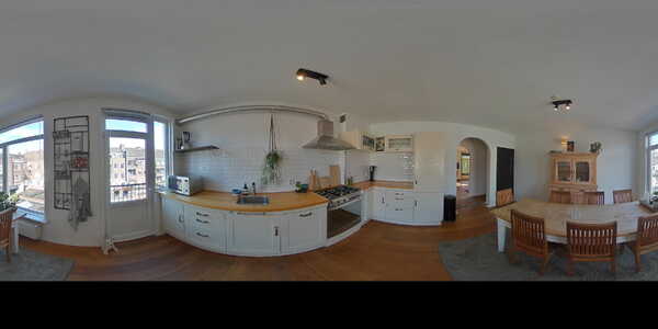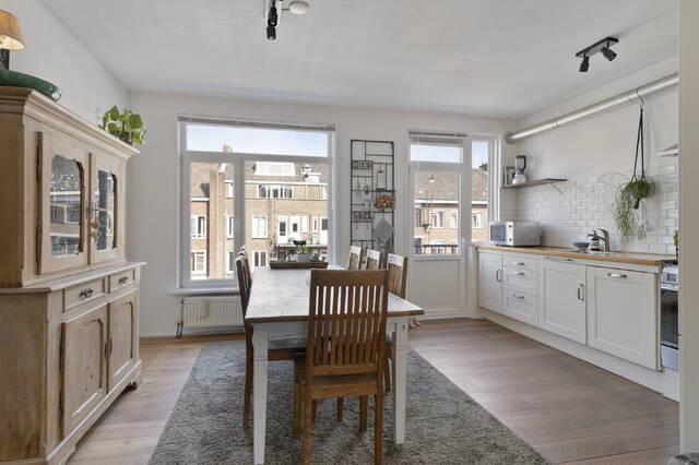 Dan lopen we aan de achterzijde de woonkeuken binnen, wat een ruimte! De keuken is een fijne plek om met vrienden te koken en lekker lang te tafelen en er na het eten een leuk spel bij te pakken. Via de keuken heb je toegang tot het eerste balkon op het zuidoosten. Op de gang treffen we het toilet en de eerste slaapkamer aan de achterzijde. Een ruime slaapkamer met inbouwkast wat superfijn is, zo heb je nog ruimte voor bijvoorbeeld een bureau!