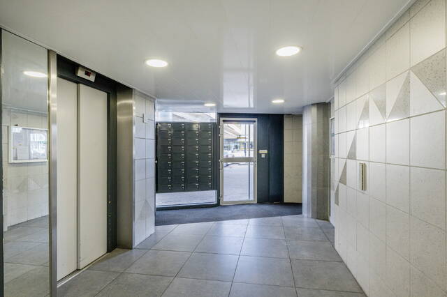 Binnenkomst in de centrale hal met brievenbussen, lift, trappenhuis en intercom. Een ideale ingang voor bewoners en bezoekers.