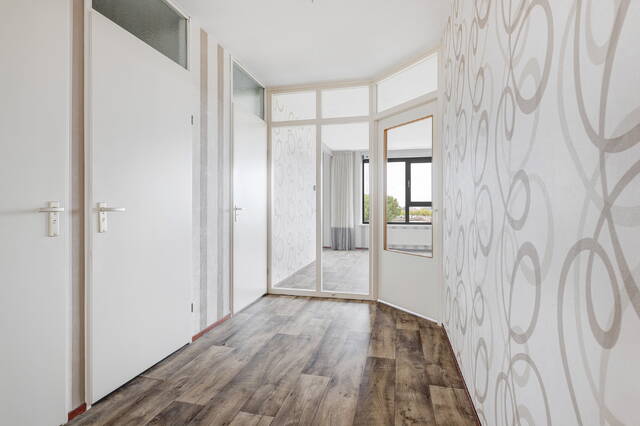 Bij binnenkomst kom je binnen in een ruime hal die toegang biedt tot alle vertrekken. De lichte woonkamer heeft grote ramen met een prachtig uitzicht over de omgeving, perfect om te ontspannen of gasten te ontvangen. Vanuit de woonkamer is de slaapkamer ensuite af te sluiten met een schuifdeur, die extra privacy biedt.
