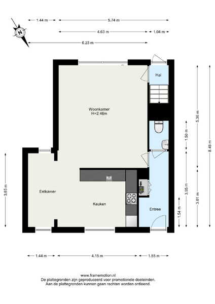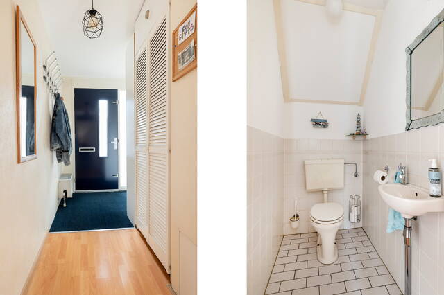 U komt binnen in de hal met de meterkast en een nette toiletruimte, gedeeltelijk betegeld in een lichte kleur en voorzien van een duoblok en fonteintje.