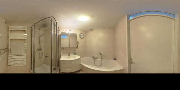 - Badkamer met ligbad, douchecabine en wastafelmeubel