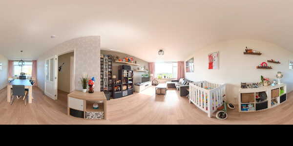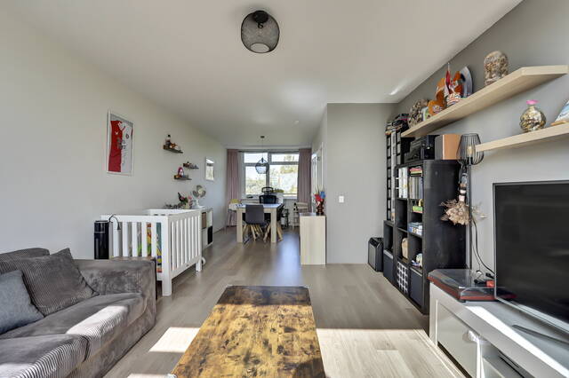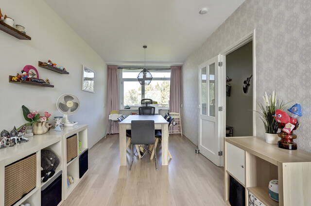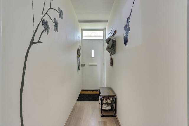 Zodra je de voordeur opent, kom je in een hal die direct toegang geeft tot de ruime en lichte woonkamer. De grote raampartijen zorgen voor een zee van daglicht, waardoor de ruimte nog groter aanvoelt dan hij al is. De gehele woonvleugel is, met uitzondering van de natte ruimtes, voorzien van een nette laminaatvloer die het geheel een moderne uitstraling geeft. Vanuit de woonkamer loop je naadloos door naar de eethoek, waar je met gemak een grote eettafel kwijt kunt voor gezellige etentjes.