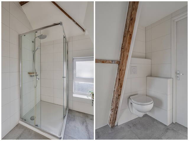 Daarnaast bevindt zich op deze verdieping de badkamer, voorzien van een grote douchecabine met zowel regen- als handdouche, een tweede toilet, een dubbele wastafel met mengkranen, een grote spiegel en een strak