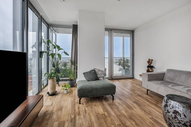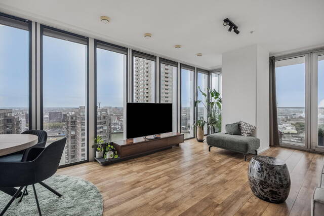 Sfeervolle lichte living (ca. 37 m²) voorzien van een lichte laminaatvloer met vloerverwarming en koeling systeem. Wonen op de 22e verdieping betekent elke dag beginnen en eindigen met een adembenemend uitzicht vanuit de royale living. Grote raampartijen zorgen voor een overvloed aan natuurlijk licht en een ruimtelijk gevoel. Middels de living heeft u toegang tot het royale balkon.