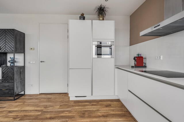 De moderne open keuken is uitgevoerd in een L-opstelling en uitgerust met diverse apparatuur zoals een Kolekast, vriezer, inductie kookplaat, RVS afzuigkap, combi ovenmagnetron en een vaatwasser. Tevens is deze complete keuken voorzien van een enkele spoelbak en kastruimte. Het geheel is uitgevoerd in wit en is afgewerkt met een composiet aanrechtblad en wanden en een lichte laminaatvloer met vloerverwarming en koeling systeem.