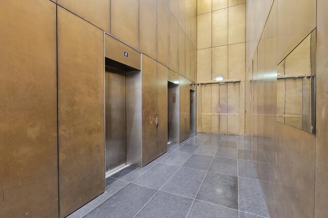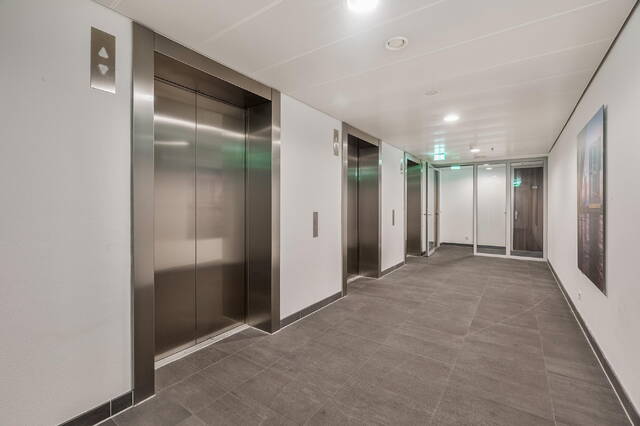 Entree met video-intercomsysteem. Gesloten centrale hal met receptionist, 3 snelle liften en trappenhuis.