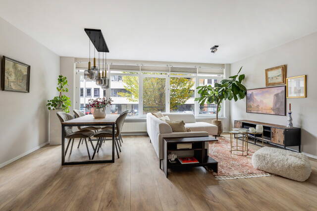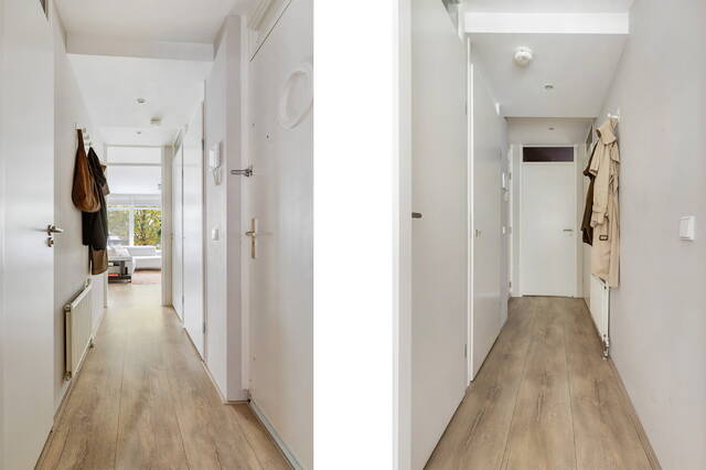 Het gehele appartement is voorzien van een doorlopende, moderne laminaatvloer, wat het geheel een strak en ruimtelijk karakter geeft.