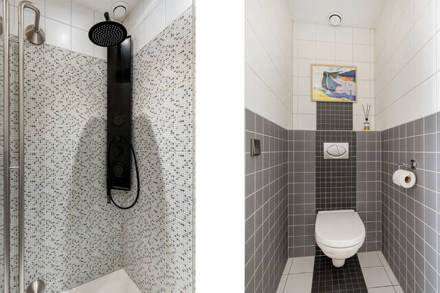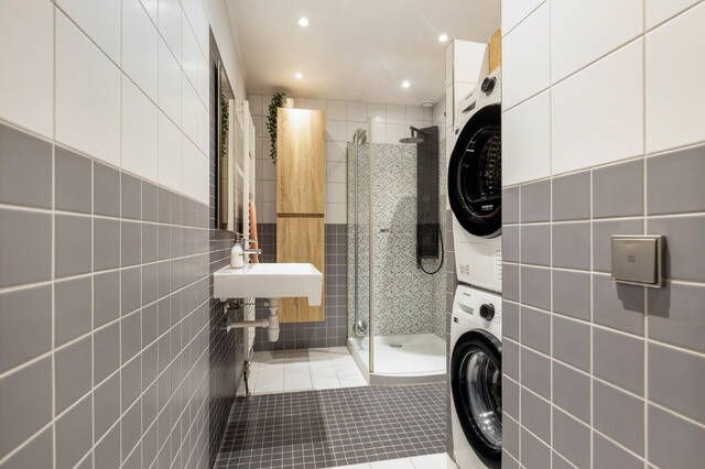 Badkamer: Fraai betegeld, met een douchecabine, wastafelmeubel en designradiator en aansluitingen voor wasmachine en droger – strak, modern en praktisch.