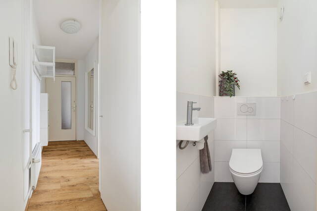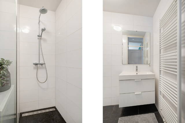 Via een tussenhal zijn de separate toiletruimte en de badkamer bereikbaar. De toiletruimte is half betegeld en voorzien van een zwevend toilet en fonteintje. De badkamer beschikt over een douche, wastafelmeubel, designradiator en aansluiting voor de wasmachine, uitgevoerd in een nette wit-grijze kleurstelling.