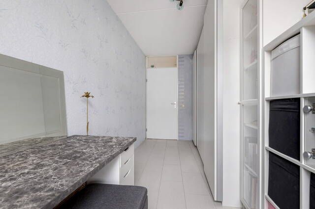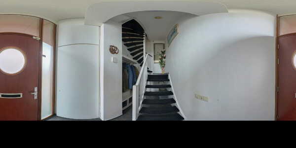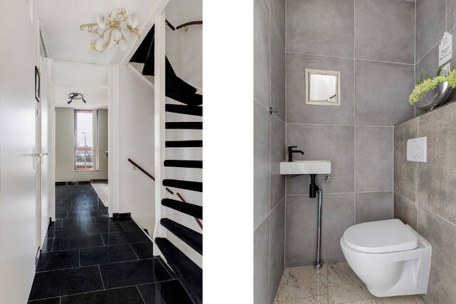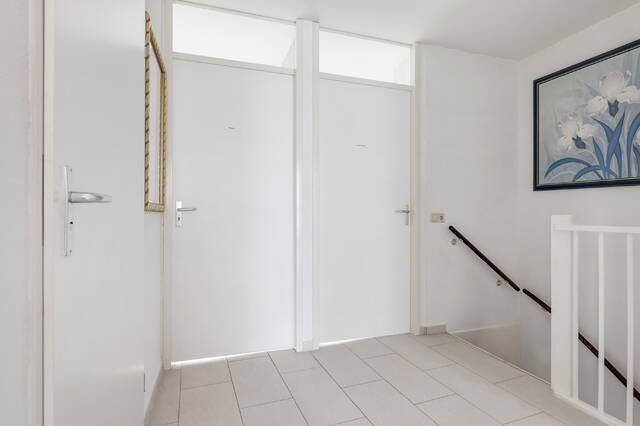 Eigen entree vanaf de straatzijde. Vanuit hier leidt een trap naar de eerste verdieping. In de hal is ruimte voor een garderobe en bevindt zich een praktische bergruimte onder de trap, ideaal voor extra opslag.