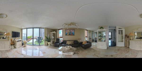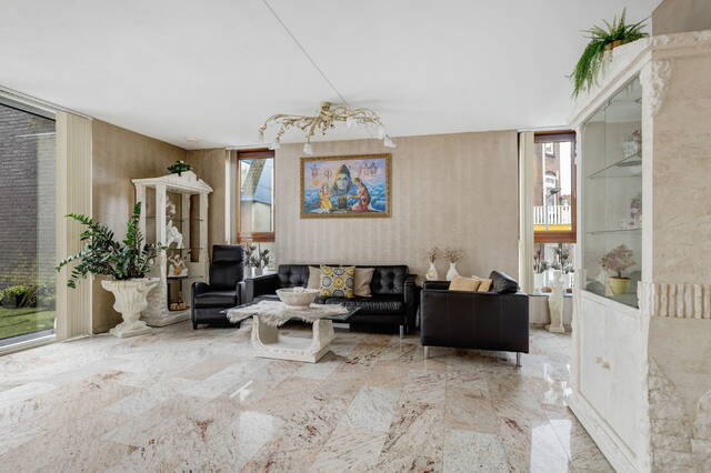 De woonkamer is licht en ruim en afgewerkt met een lichte granieten vloer voorzien van vloerverwarming. De wanden zijn afgewerkt met behang. Schuifdeuren met een hor geven direct toegang tot het terras, waardoor binnen en buiten mooi in elkaar overlopen.